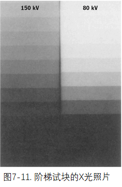 辐射硬度和胶片对比度是什么? 辐射硬度和胶片对比度是什么? 当辐射硬度增加时,半值厚度(HVT)也会增加。钢和铅的表2-2和3-2分别以数据形式显示了这一点。 这就是为什么在一个厚度不同的物体中,当辐射硬度增加时,图像对比度会减小。图7-11清楚地说明了这一点。 阶梯楔的左侧用150千伏进行射线照射,右侧用80千伏。右侧显示两个步骤之间更大的对比度,而左侧的对比度范围最大。